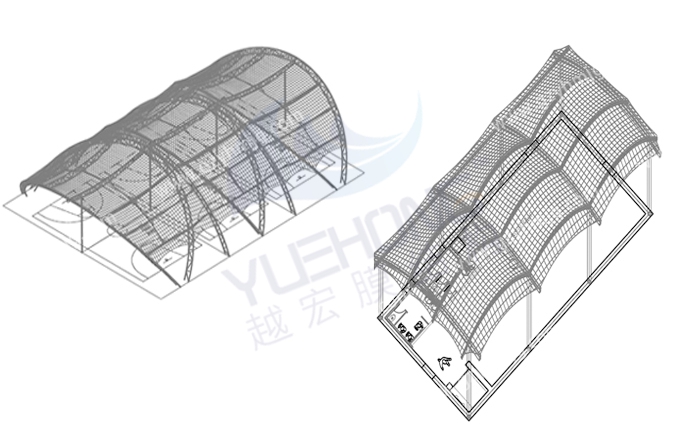 越宏膜結(jié)構(gòu)廠家的風(fēng)雨球場膜結(jié)構(gòu)是由鋼結(jié)構(gòu)和膜材組成,分別有張拉式膜結(jié)構(gòu)、索膜結(jié)構(gòu)、骨架式膜結(jié)構(gòu)、空間結(jié)構(gòu)式等供選擇,根據(jù)不同場景進行設(shè)計出個性化膜結(jié)構(gòu)。
